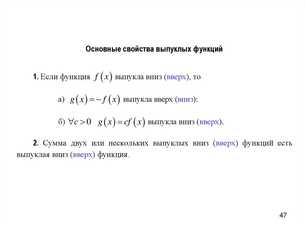 Основные свойства выпуклых функций1. Если функция f x выпукла вниз (вверх), то