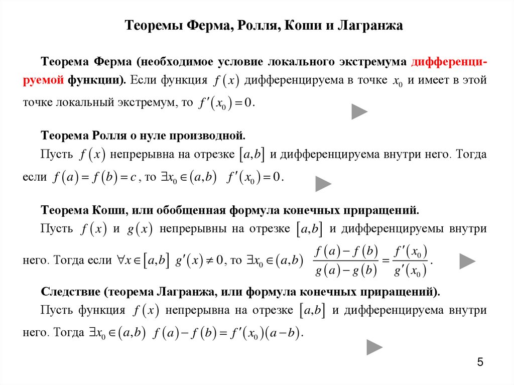 Теоремы Ферма, Ролля, Коши и ЛагранжаТеорема Ферма (необходимое условие локального экстремума дифференцируемой функции). Если функция f x дифференцируема в точке x0 и имеет в этой