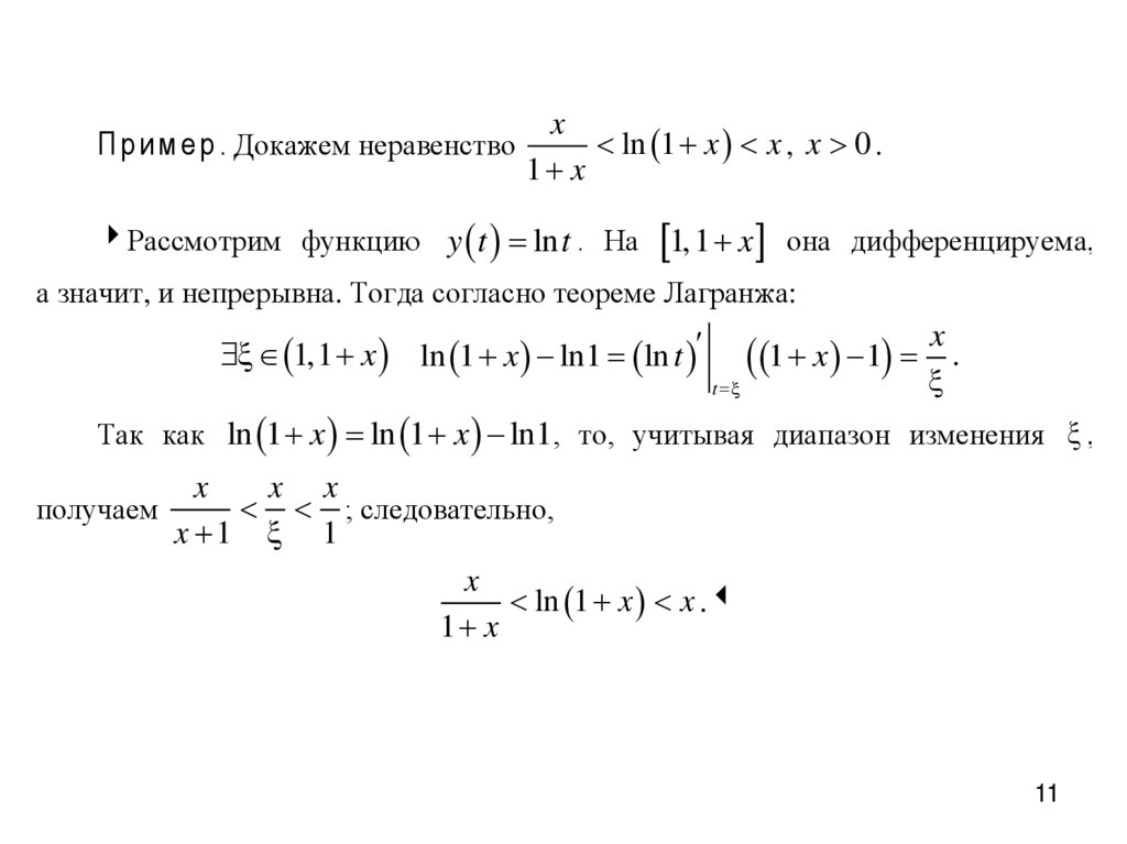 Рассмотрим функцию y t ln t . На 1, 1 x она дифференцируема,