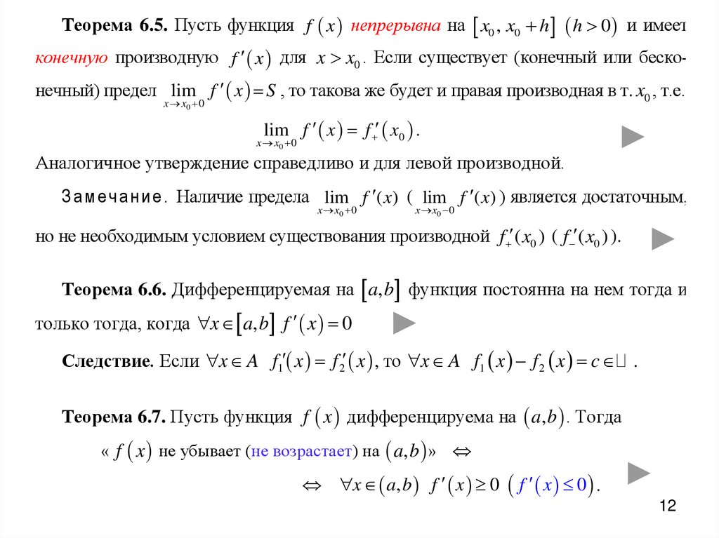 Теорема 6.5. Пусть функция f x непрерывна на x0 , x0 h h 0 и имеетконечную производную f x для x x0 . Если существует (конечный или бесконечный) предел lim f x S , то такова же будет и правая производная в т. x0 , т.е.