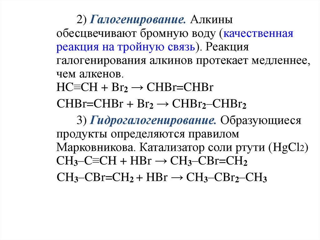 2) Галогенирование. Алкиныобесцвечивают бромную воду (качественная