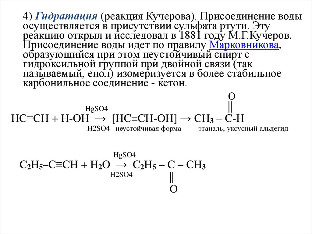 4) Гидратация (реакция Кучерова). Присоединение водыосуществляется в присутствии сульфата ртути. Эту