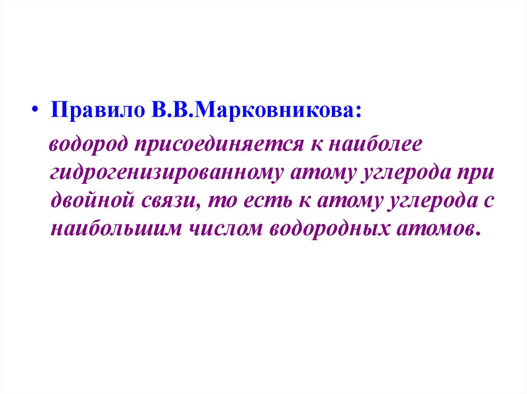 • Правило В.В.Марковникова:водород присоединяется к наиболее