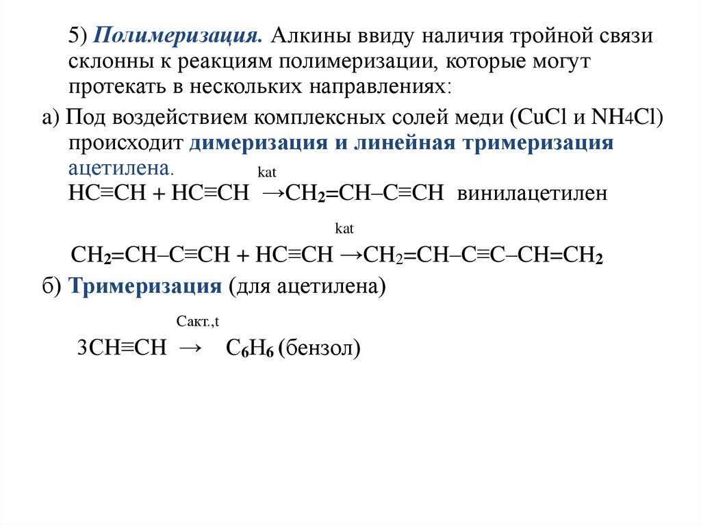 5) Полимеризация. Алкины ввиду наличия тройной связисклонны к реакциям полимеризации, которые могут