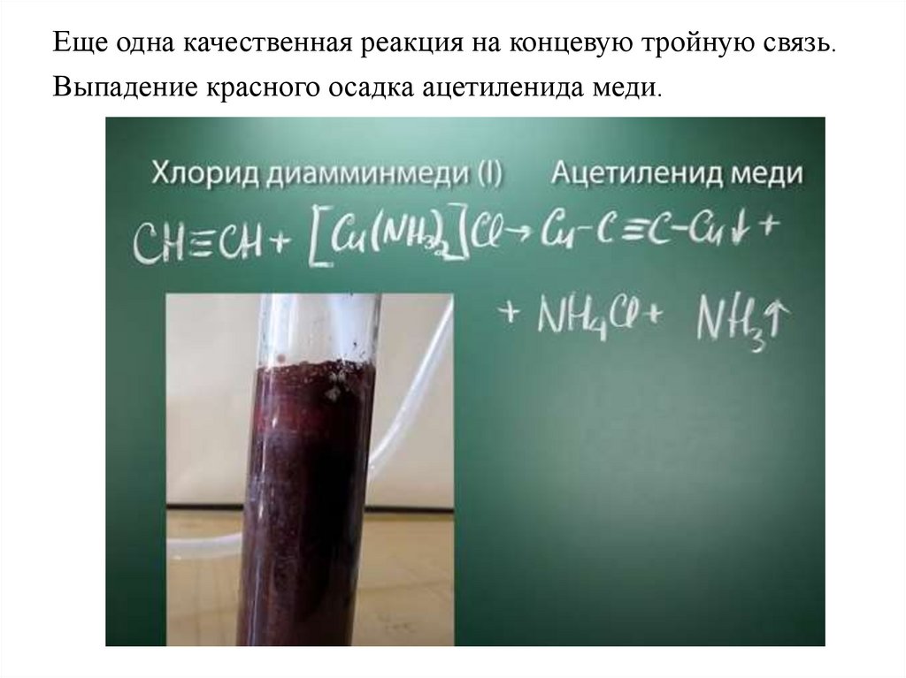 Еще одна качественная реакция на концевую тройную связь.Выпадение красного осадка ацетиленида меди.