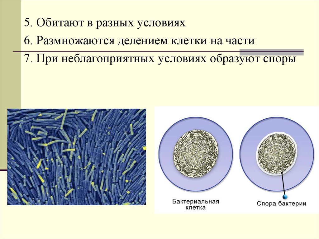 5. Обитают в разных условиях6. Размножаются делением клетки на части