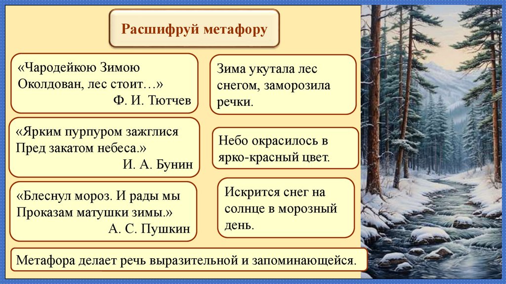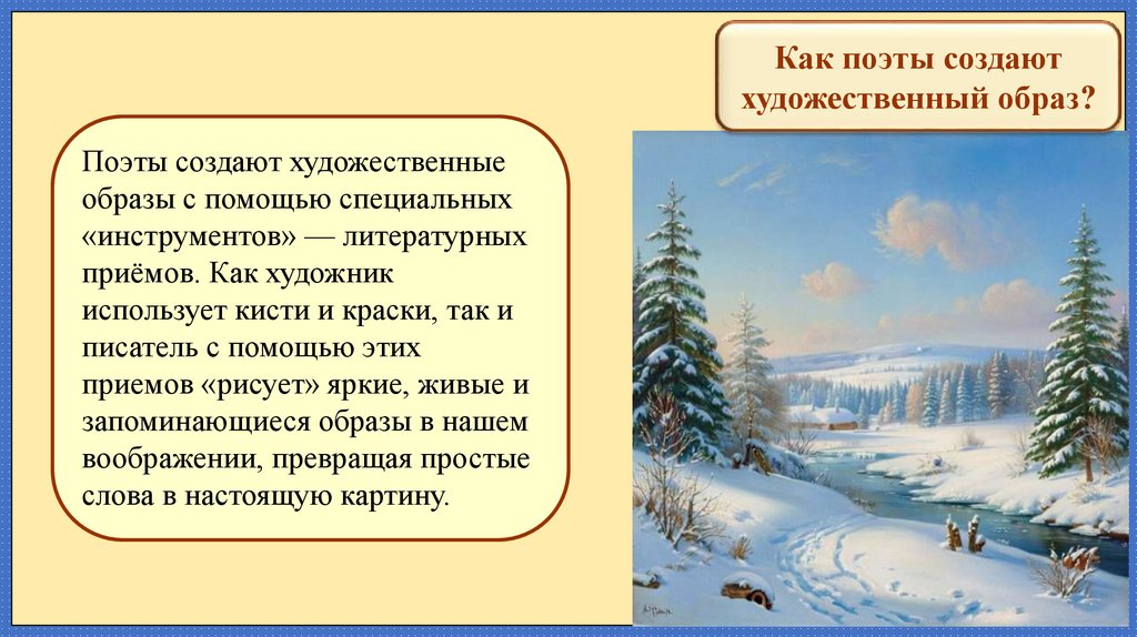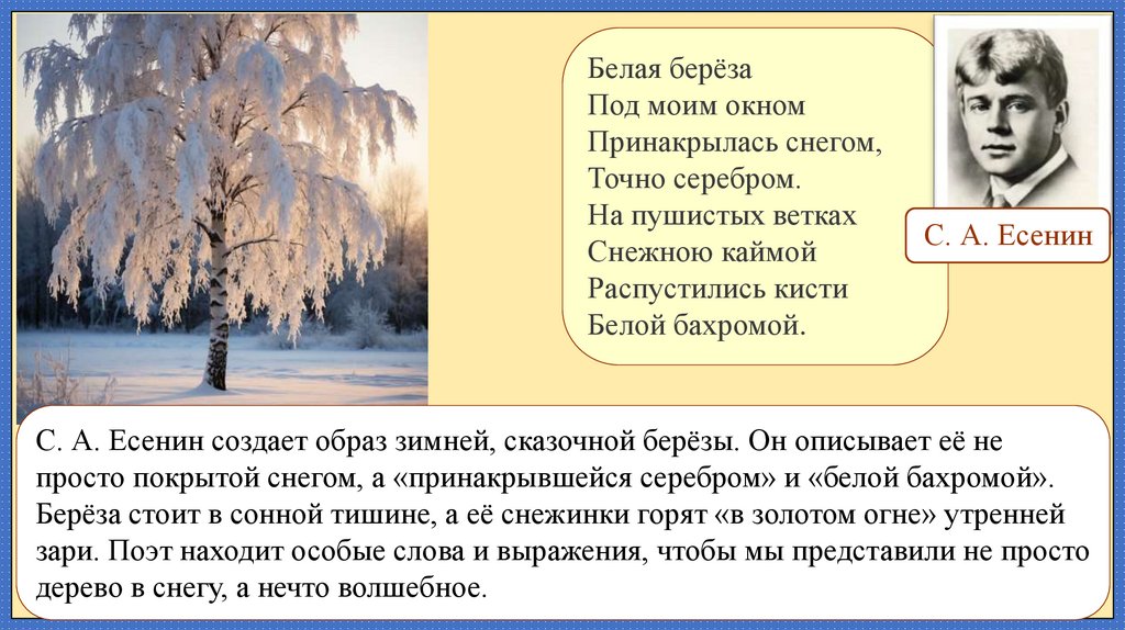 С. А. Есенин создает образ зимней, сказочной берёзы. Он описывает её не