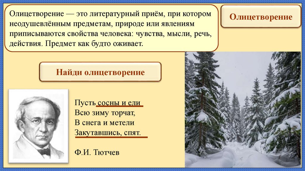 Олицетворение — это литературный приём, при которомнеодушевлённым предметам, природе или явлениям