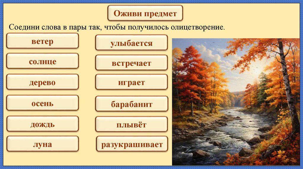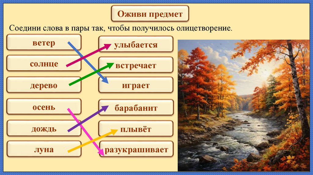 Оживи предметСоедини слова в пары так, чтобы получилось олицетворение.