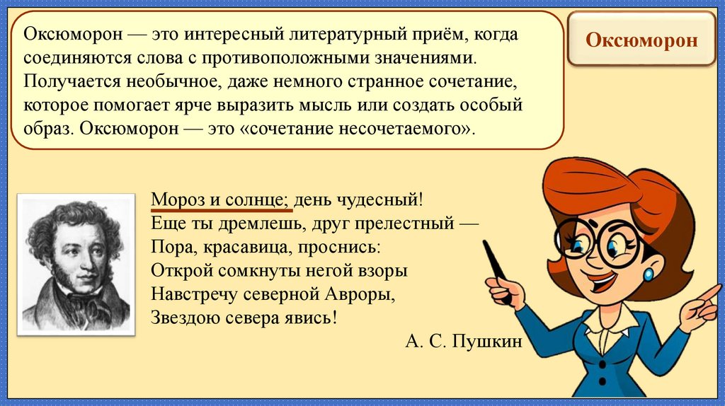 Оксюморон — это интересный литературный приём, когдасоединяются слова с противоположными значениями.