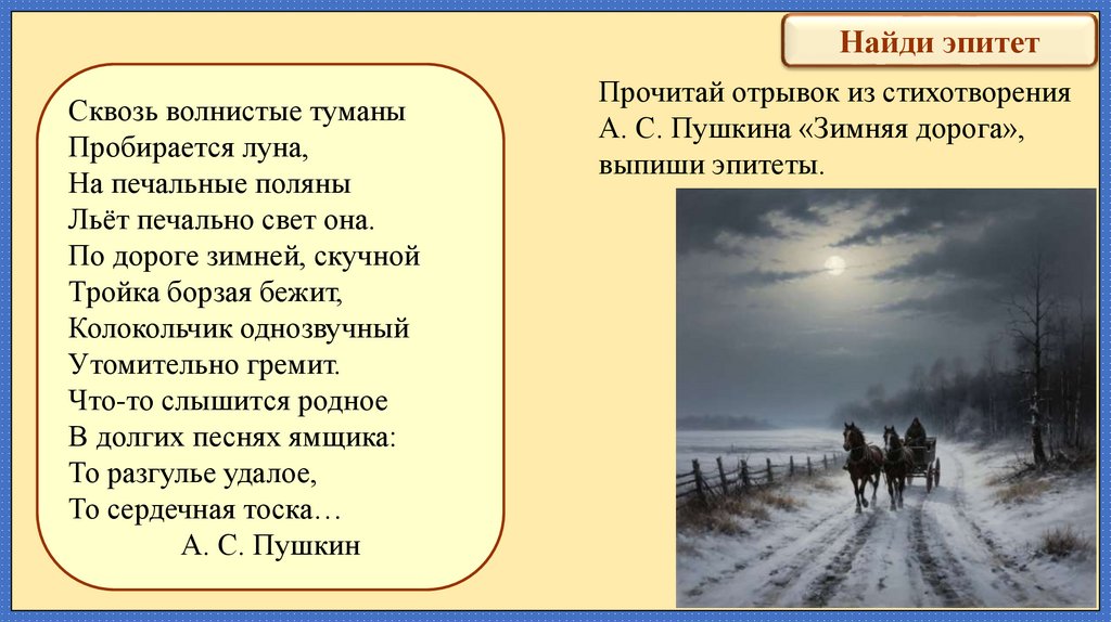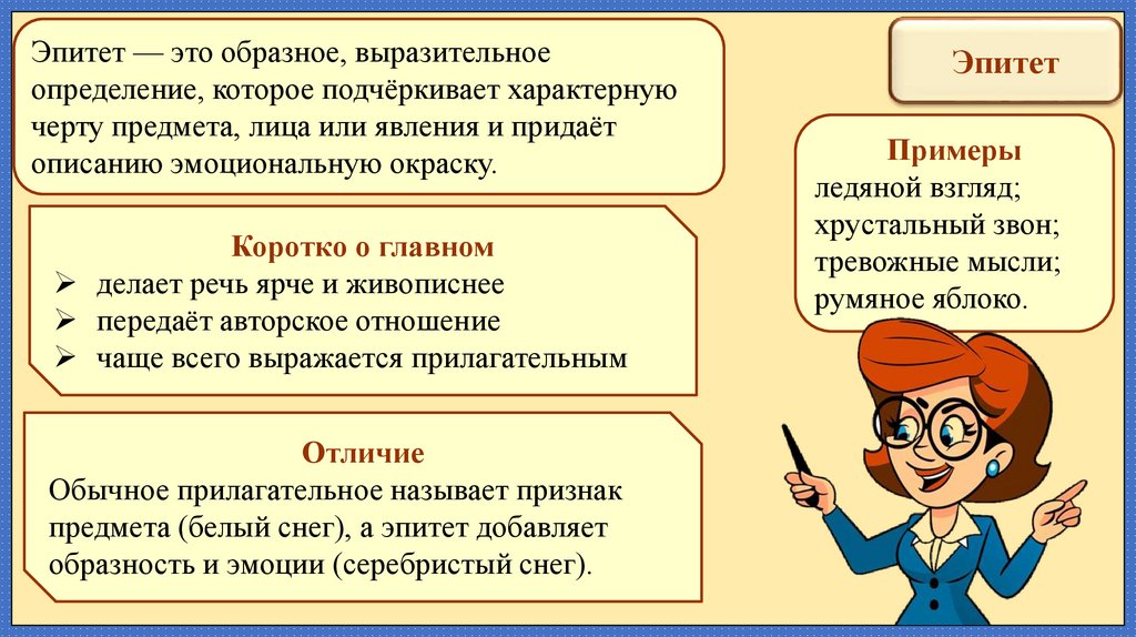Эпитет — это образное, выразительноеопределение, которое подчёркивает характерную