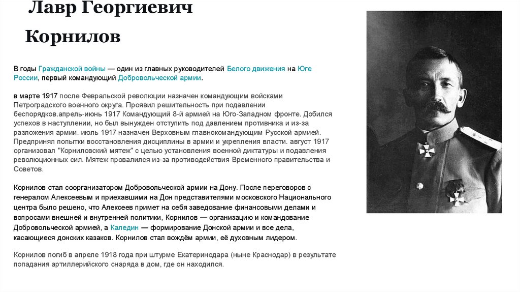 Георгиевичем Корниловым начал формирование антибольшевистских сил –