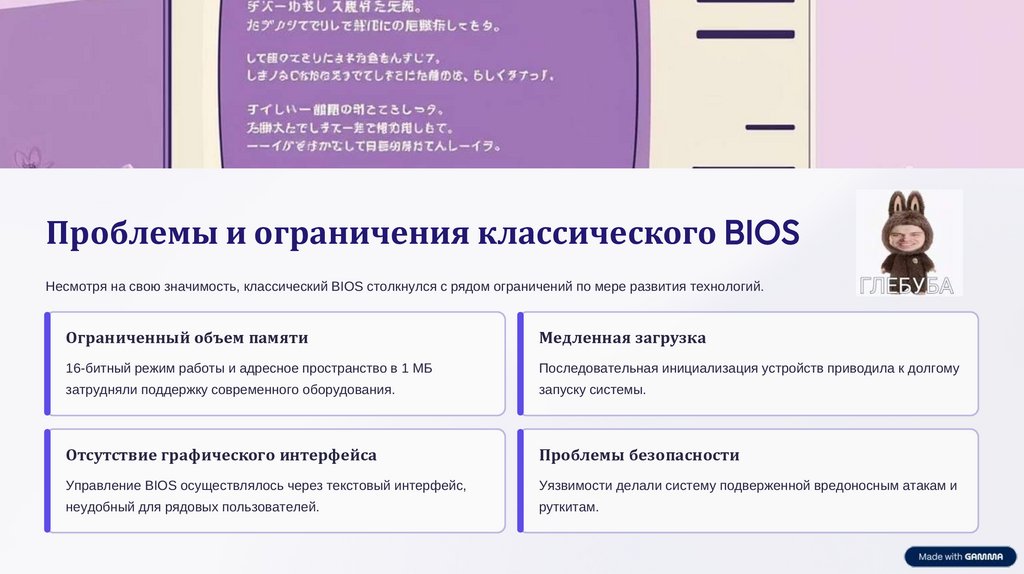 Проблемы и ограничения классического BIOSНесмотря на свою значимость, классический BIOS столкнулся с рядом ограничений по мере развития технологий.