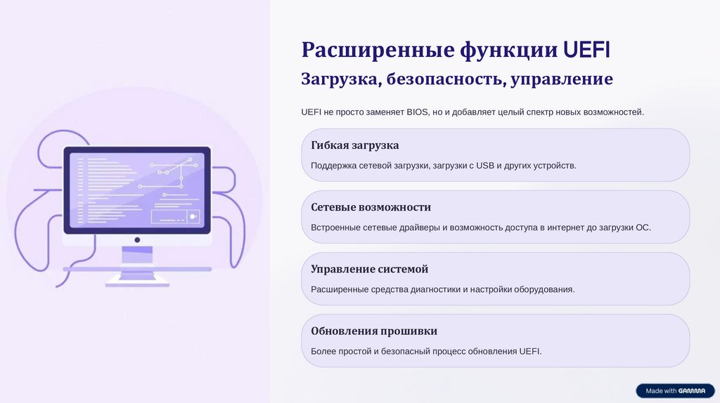 UEFI позволяет использовать графический интерфейс, поддержку сетевых функций и модульную архитектуру, что открывает путь для будущих инноваций.