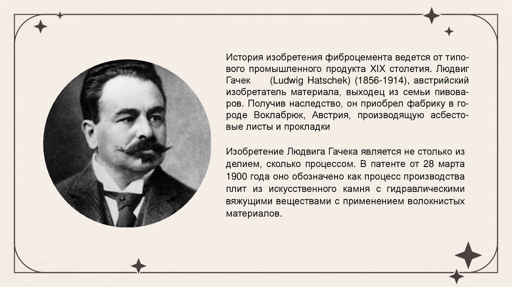 История изобретения фиброцемента ведется от типового промышленного продукта XIX столетия. ЛюдвигГачек