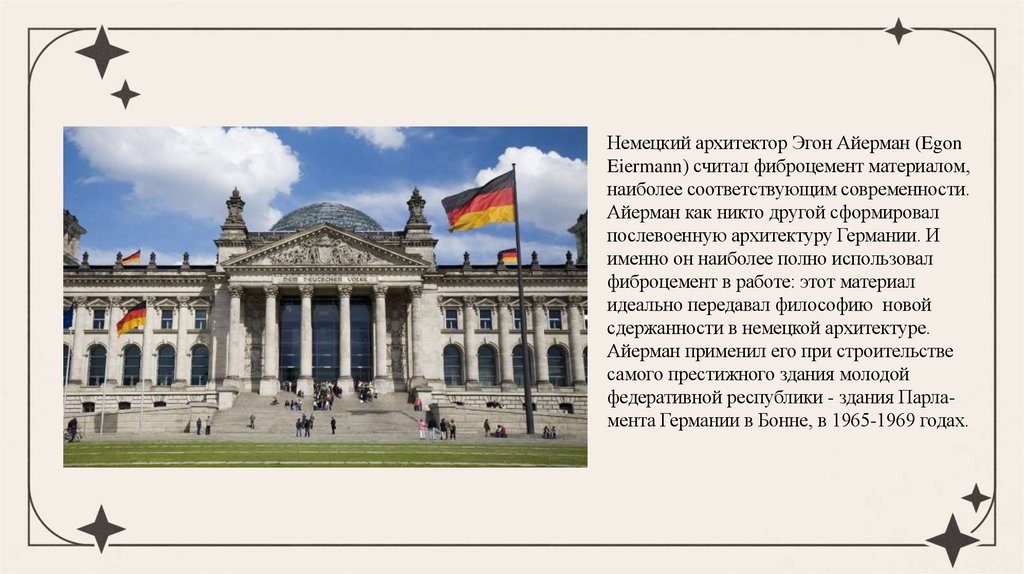 Немецкий архитектор Эгон Айерман (EgonEiermann) считал фиброцемент материалом,