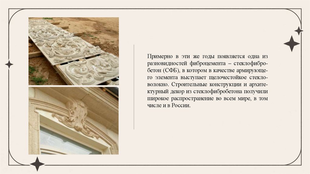 Примерно в эти же годы появляется одна изразновидностей фиброцемента – стеклофибробетон (СФБ), в котором в качестве армирующего элемента выступает щелочестойкое стекловолокно. Строительные конструкции и архитектурный декор из стеклофибробетона получили