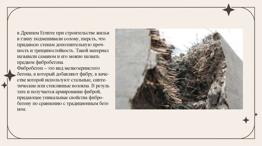 бетона, в который добавляют фибру, в качестве которой используют стальные, синтетические или стеклянные волокна. В резуль