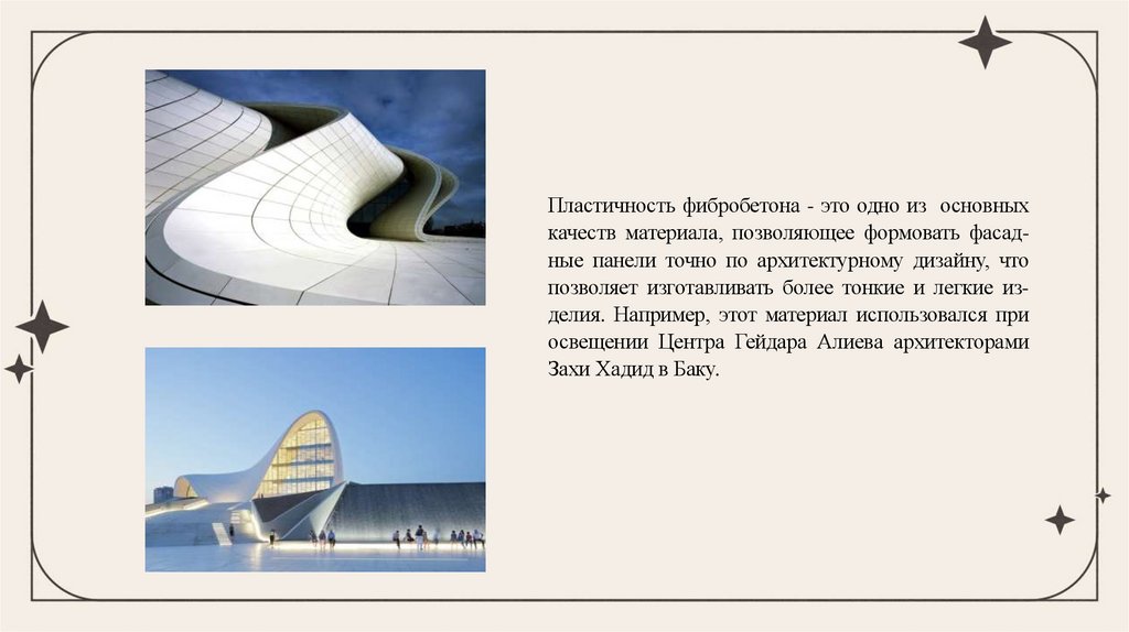 Пластичность фибробетона - это одно из основныхкачеств материала, позволяющее формовать фасадные панели точно по архитектурному дизайну, что