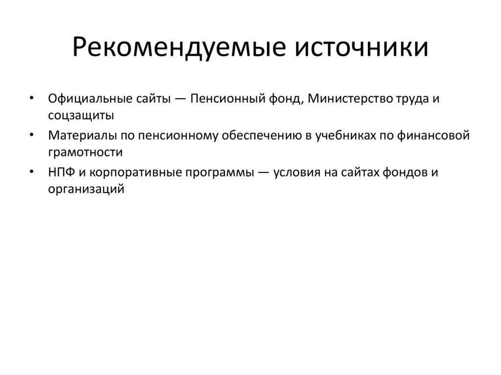 Рекомендуемые источники• Официальные сайты — Пенсионный фонд, Министерство труда и