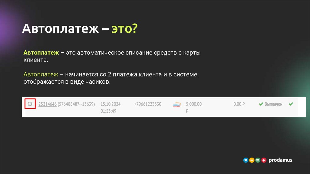 Автоплатеж – начинается со 2 платежа клиента и в системе