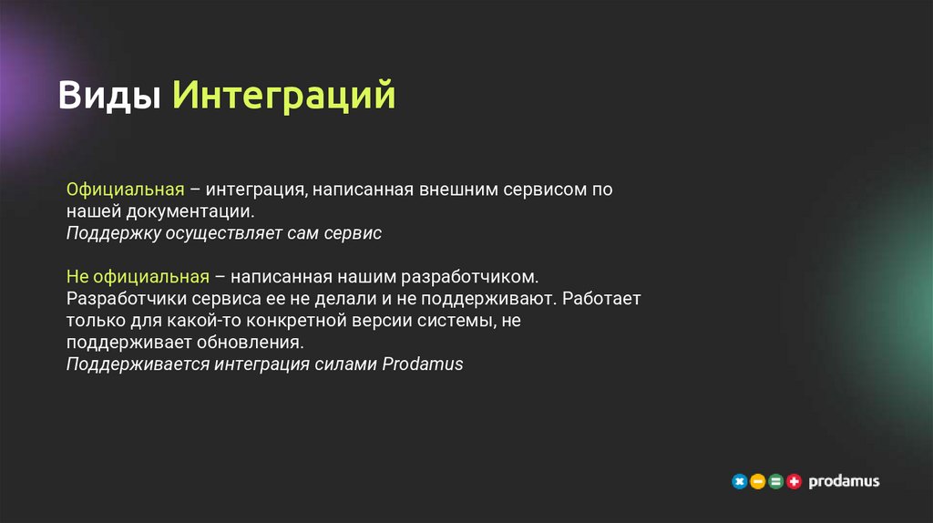 Виды ИнтеграцийОфициальная – интеграция, написанная внешним сервисом по