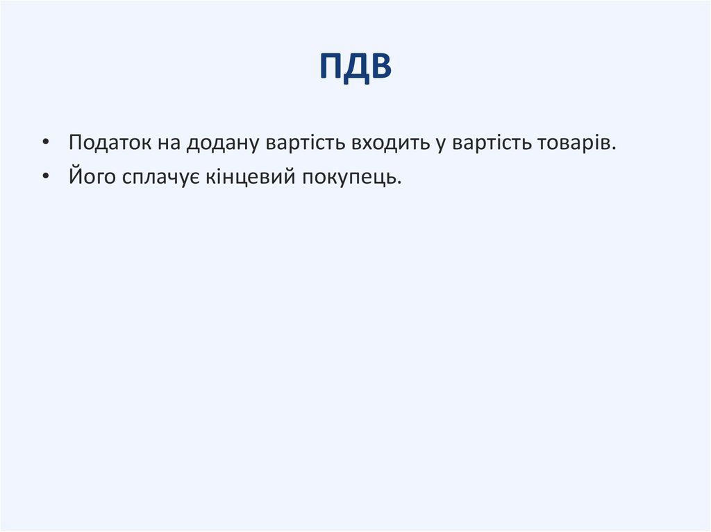 ПДВ• Податок на додану вартість входить у вартість товарів.