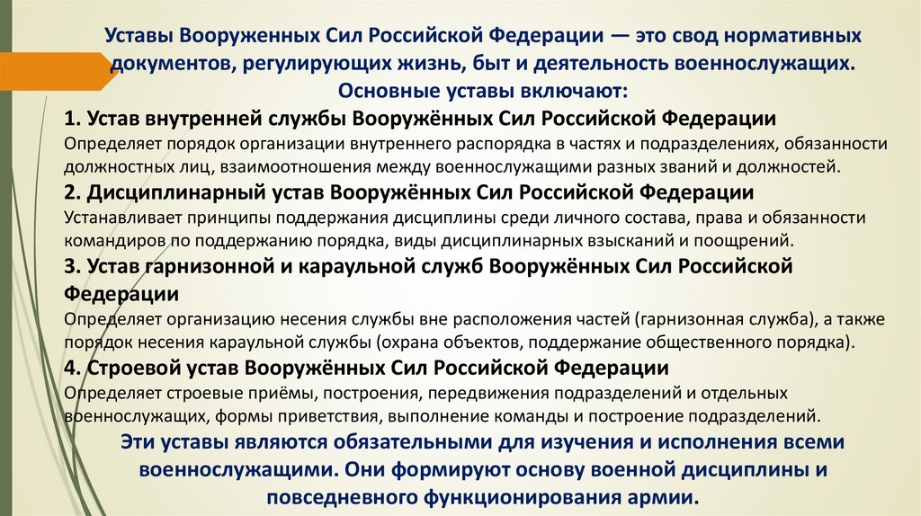 Уставы Вооруженных Сил Российской Федерации — это свод нормативныхдокументов, регулирующих жизнь, быт и деятельность военнослужащих.
