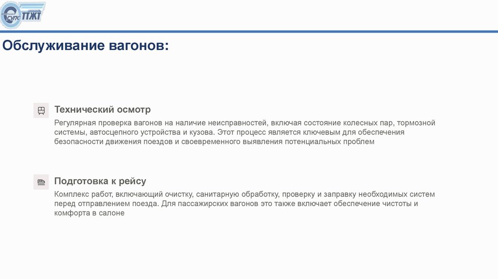 перед отправлением поезда. Для пассажирских вагонов это также включает обеспечение чистоты и