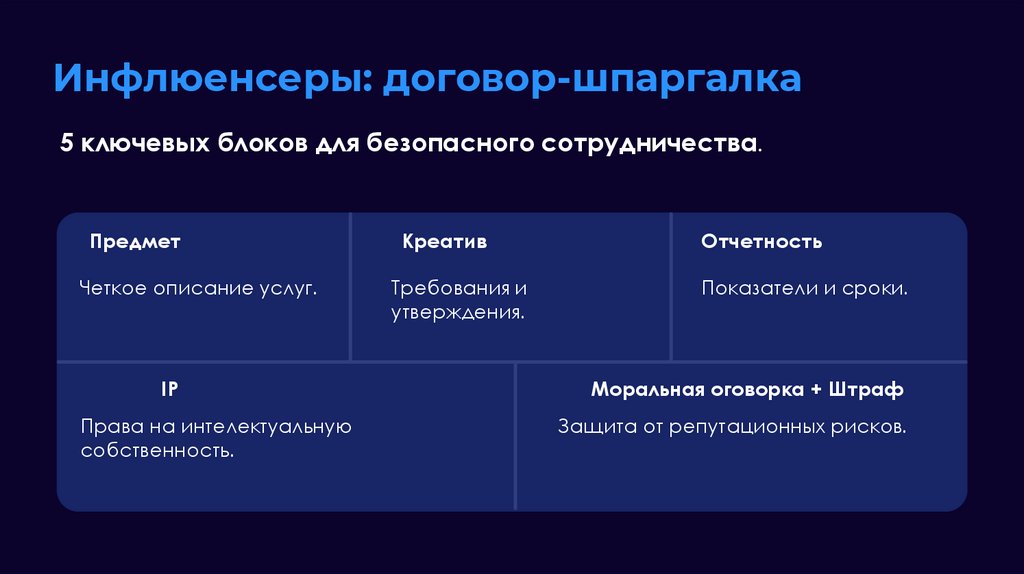 Инфлюенсеры: договор-шпаргалка5 ключевых блоков для безопасного сотрудничества.