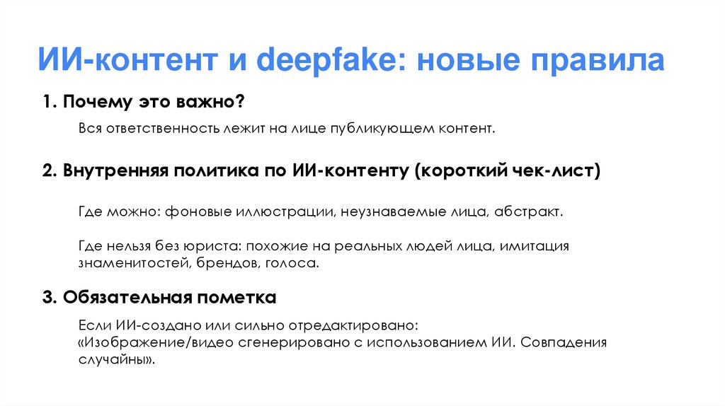 2. Внутренняя политика по ИИ-контенту (короткий чек-лист)
