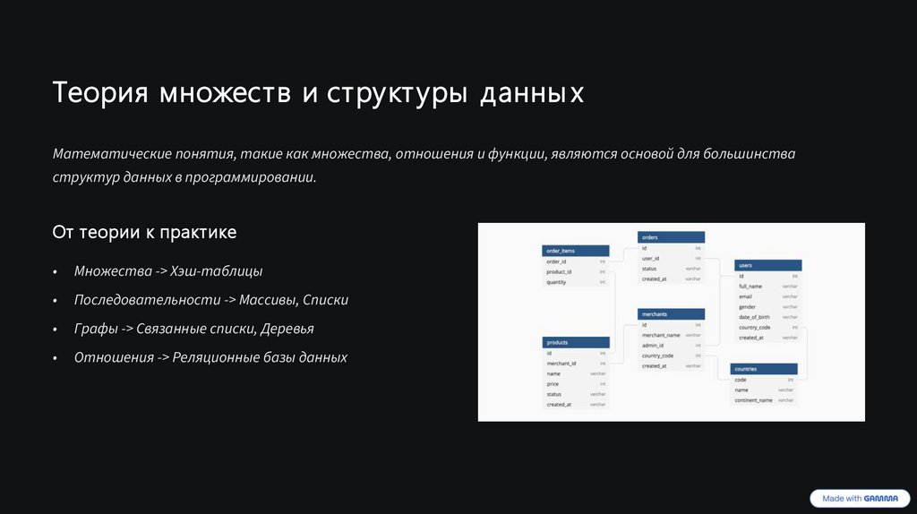 Теория множеств и структ уры данны хМатематические понятия, такие как множества, отношения и функции, являются основой для большинства