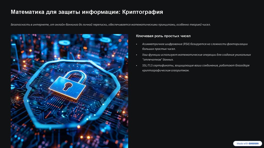 Математика для защиты информации: КриптографияБезопасность в интернете, от онлайн-банкинга до личной переписки, обеспечивается математическими принципами, особенно теорией чисел.