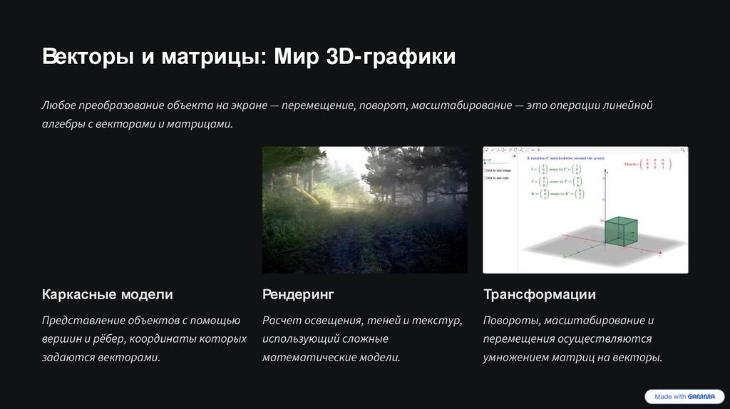 Векторы и матрицы: Мир 3D-графикиЛюбое преобразование объекта на экране — перемещение, поворот, масштабирование — это операции линейной