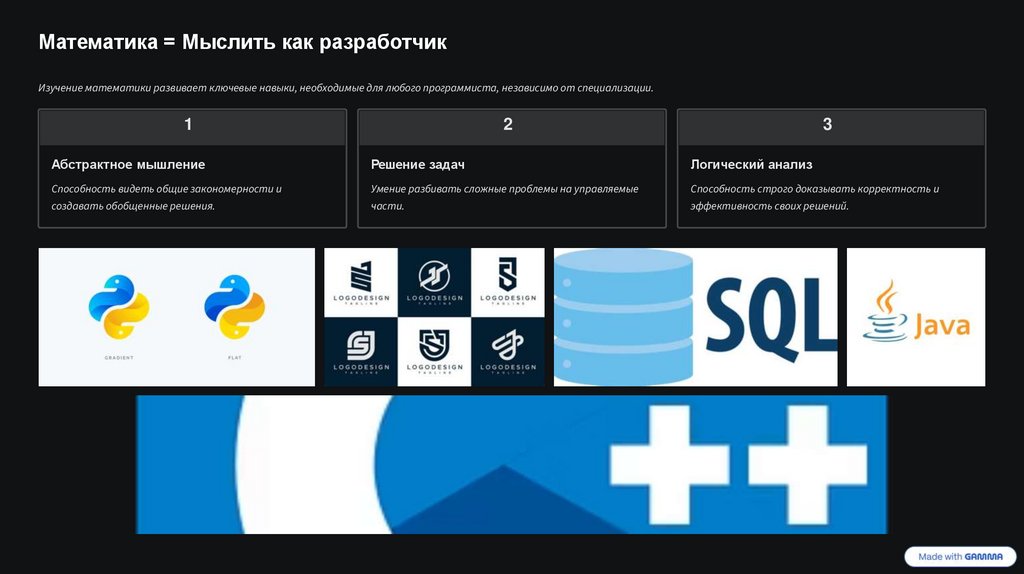 Математика = Мыслить как разработчикИзучение математики развивает ключевые навыки, необходимые для любого программиста, независимо от специализации.