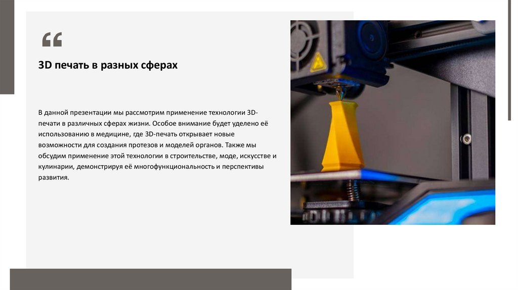 3D печать в разных сферахВ данной презентации мы рассмотрим применение технологии 3Dпечати в различных сферах жизни. Особое внимание будет уделено её