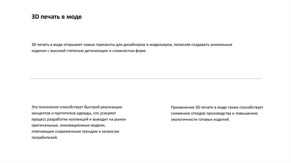3D печать в моде3D печать в моде открывает новые горизонты для дизайнеров и модельеров, позволяя создавать уникальные