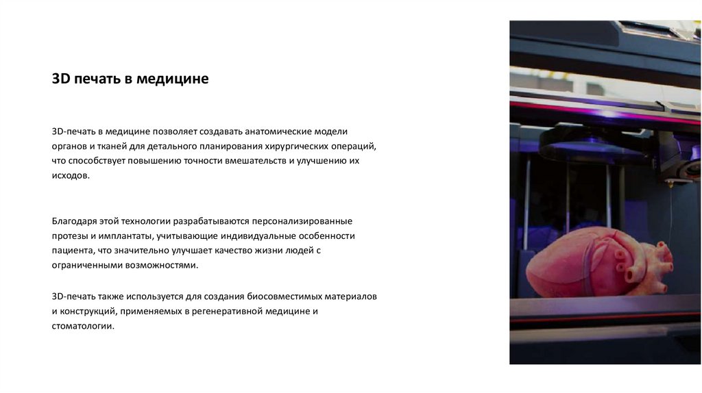 3D печать в медицине3D-печать в медицине позволяет создавать анатомические модели
