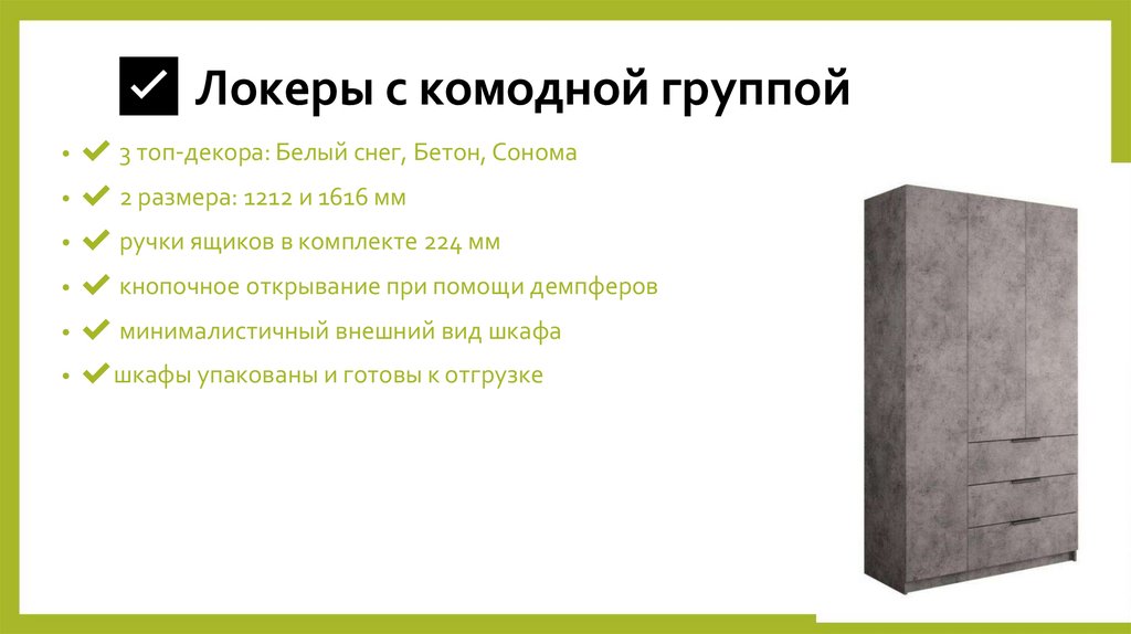 ✅ Локеры с комодной группой• ✔ 3 топ-декора: Белый снег, Бетон, Сонома