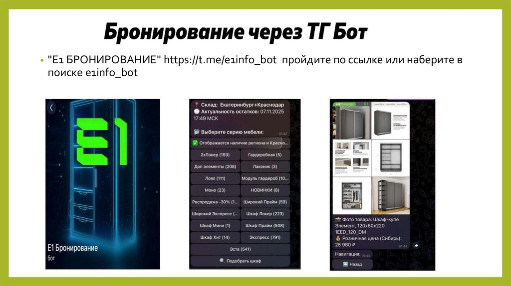 • "Е1 БРОНИРОВАНИЕ" https://t.me/e1info_bot пройдите по ссылке или наберите впоиске e1info_bot