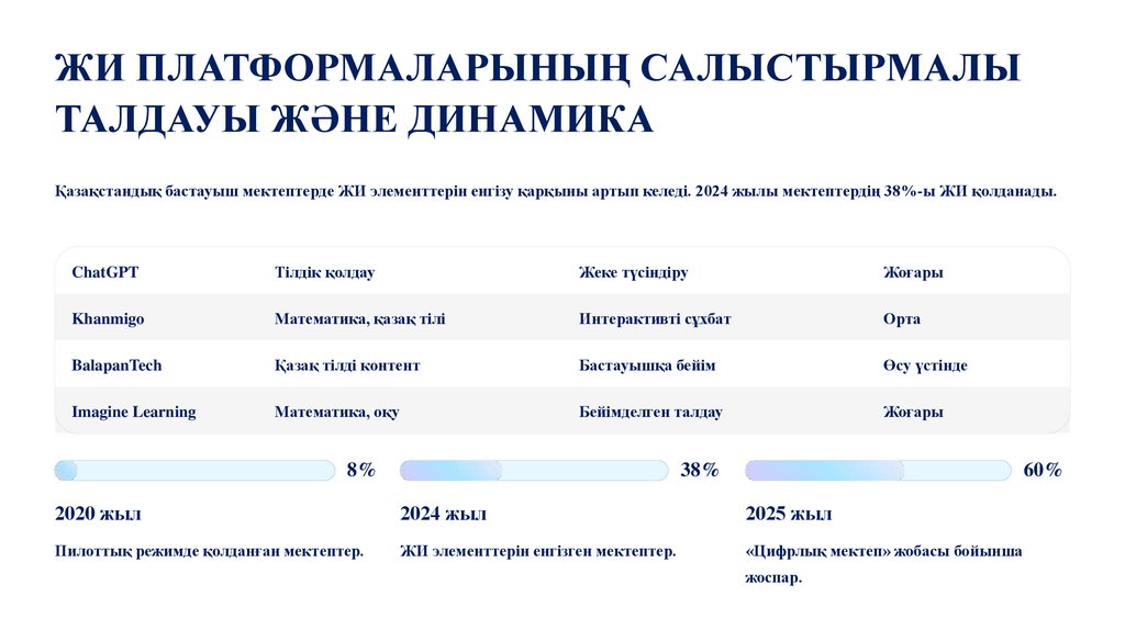 Қазақстандық бастауыш мектептерде ЖИ элементтерін енгізу қарқыны артып келеді. 2024 жылы мектептердің 38%-ы ЖИ қолданады.