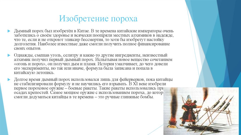 Изобретение порохаДымный порох был изобретён в Китае. В те времена китайские императоры очень