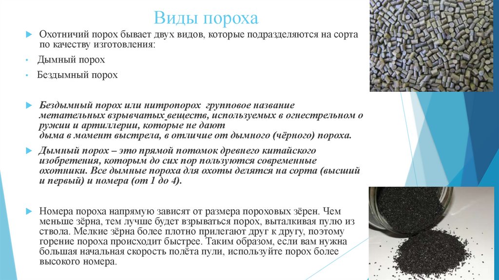 Виды порохаОхотничий порох бывает двух видов, которые подразделяются на сорта