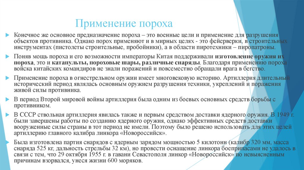 Применение порохаКонечное же основное предназначение пороха – это военные цели и применение для разрушения