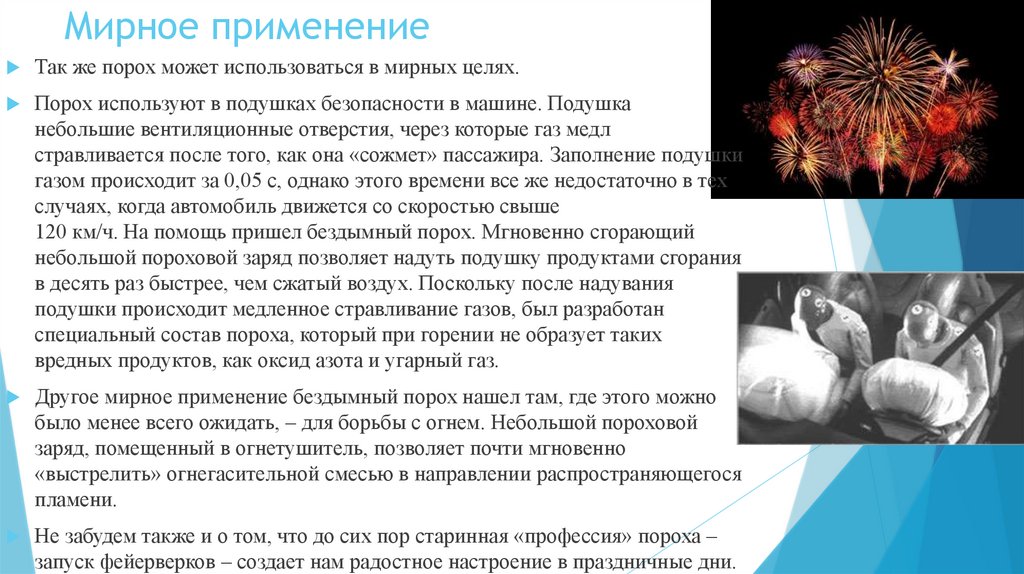 объектов противника. Однако порох применяют и в мирных целях - это фейерверки, в строительных