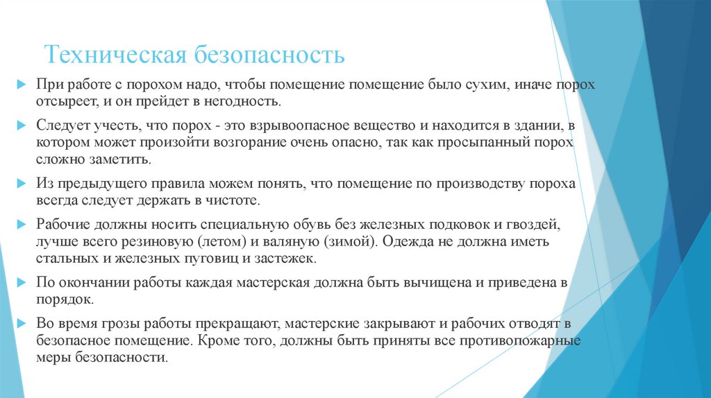 Техническая безопасностьПри работе с порохом надо, чтобы помещение помещение было сухим, иначе порох
