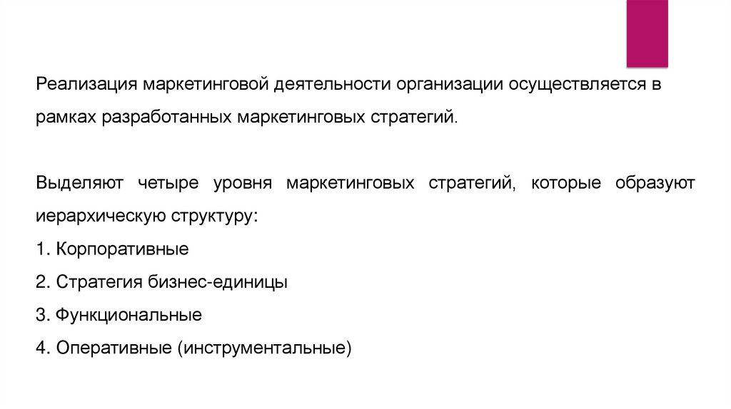 Выделяют четыре уровня маркетинговых стратегий, которые образуют