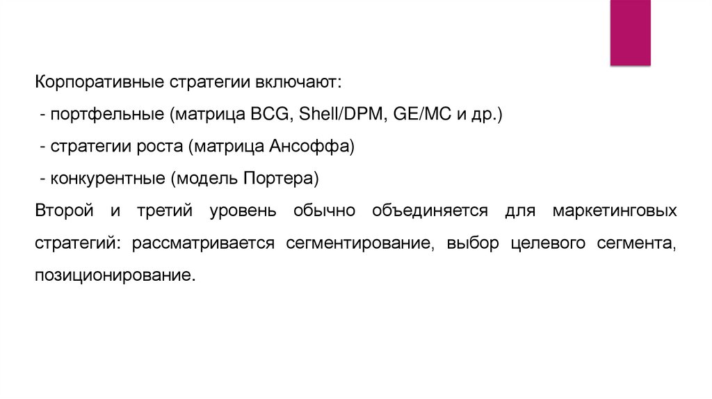 Корпоративные стратегии включают:- портфельные (матрица BCG, Shell/DPM, GE/MC и др.)