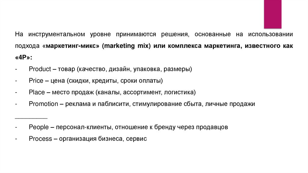 На инструментальном уровне принимаются решения, основанные на использованииподхода «маркетинг-микс» (marketing mix) или комплекса маркетинга, известного как