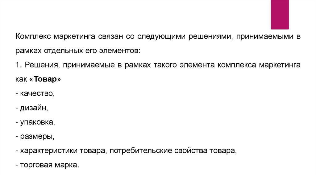 1. Решения, принимаемые в рамках такого элемента комплекса маркетинга